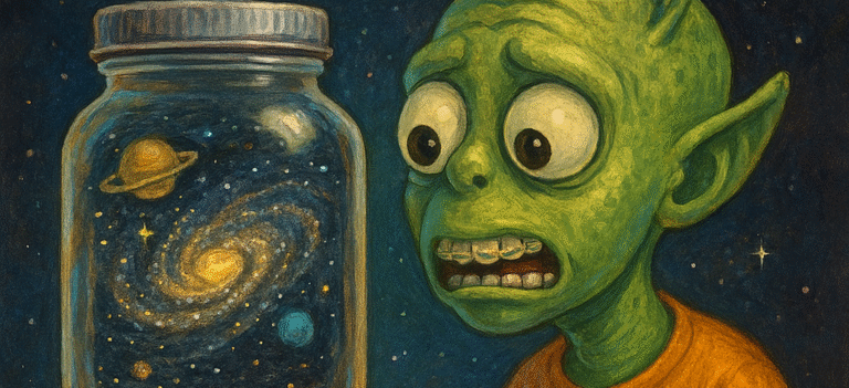 🚀 When Teen Hormones Meet Interstellar Physics Zorblat just wanted to impress Glorbnella. Instead, his glitter-covered comet stunt triggered Earth-wide panic, Harvard speculation, and a galactic PR disaster. What began as a science fair flex turned into a 130,000-mph cosmic oopsie—complete with blinding braces, anti-glare regrets, and one very confused solar system. Turns out, not every alien probe is hostile. Sometimes it’s just a teenager trying to get a date.